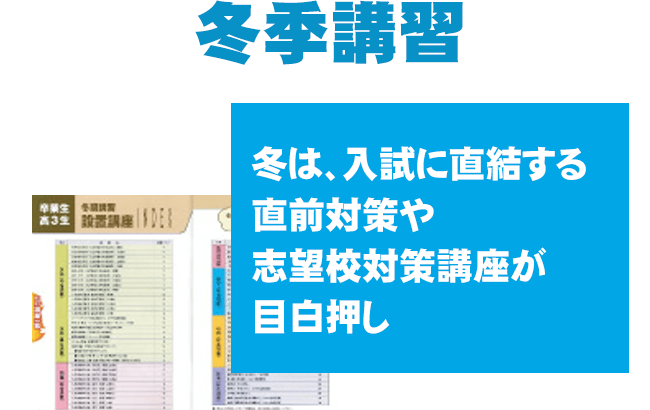 もうひとつのテーマは、志望校対策を万全にすることです。多種多彩な志望校別講座を用意して、出題傾向の分析や予想問題の演習などを行ない、出題傾向に合った万全な対策を行います。