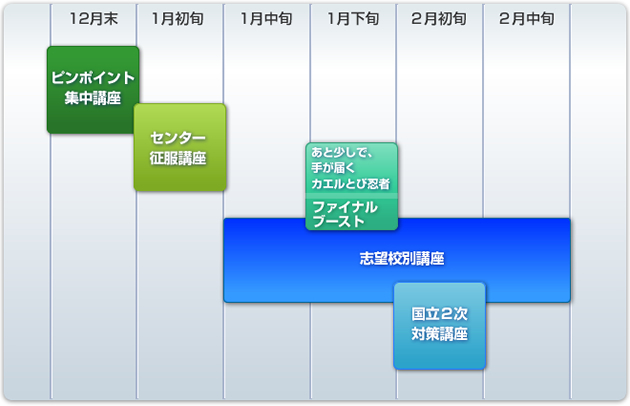 入試直前は、家にいても勉強が手につかないものです。そこで、直前期に主要科目の感を鈍らせず、総合得点力を上げる為に、様々な対策講座を開催します。この怒濤のラストスパートで、奇跡の大逆転劇を実現させるのです。直前期には、授業を終えてしまう予備校生が多い中、みすずは1月、2月に入ってからも、対策講座が目白押しです。特に現役生にとっては、これが高校生に追いつき追い越す決定打となります。