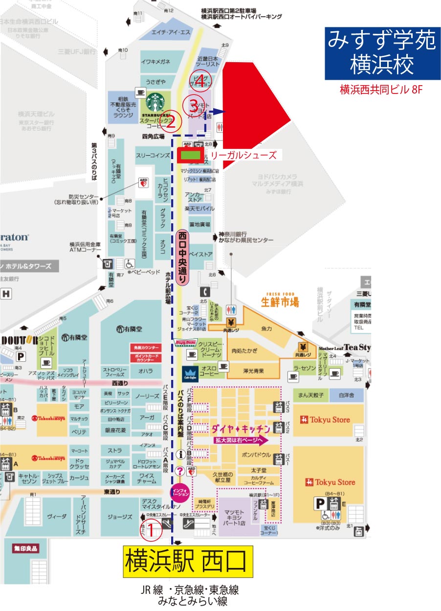 みすず学苑の横浜校は、雨が降っても大丈夫。横浜駅から、雨に濡れないで登校できます。横浜駅の西口にあるダイヤモンド地下街の「北8」を出て、地上に上がった所が横浜校です。もちろん地上を歩いてもOK。横浜駅西口に広がるメインストリート沿いにありますので、駅からすぐ。便利このうえありません。